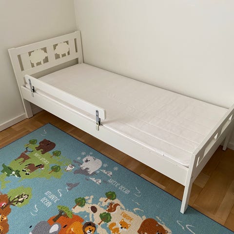 IKEA Kritter barnsäng enkelsäng i vitlackerat trä. Sängen har dekorativa fårmotiv i huvudgaveln och ribbotten i trä. Passar som enkelsäng i barnrum. Madrassstorlek enligt standardmått för barnsäng/enkelsäng (se mått vid behov). Enkel, rak design som fungerar i de flesta barnrum och kan kombineras med olika textilier och förvaringslösningar.