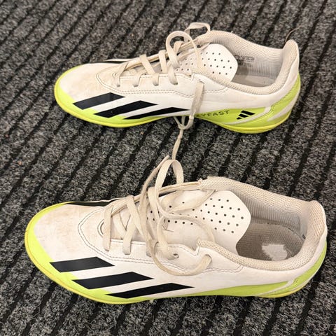 Adidas fotbollsskor för inomhusbruk. Stlk 35. Skorna är svarta med vita Adidas-ränder och detaljer i orange. Yttersulan är i ljusgummi, anpassad för inomhusplaner och ger bra grepp på sporthallsgolv. Snörning framtill för justerbar passform. Passar för futsal eller annan inomhusfotboll.