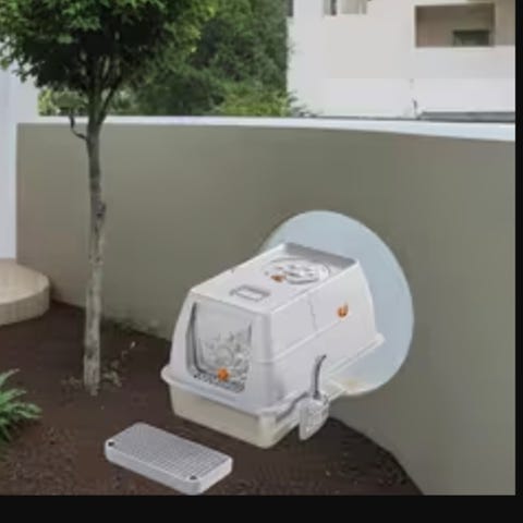 Kattlåda med huv i vit och grå plast. Lådan har en svängdörr framtill och hög kant runt om för att minska spridning av sand. Samt ett filter för att minska oönskad doft från kattlådan.
