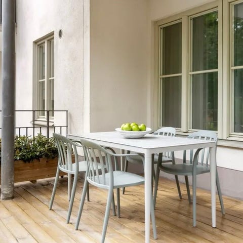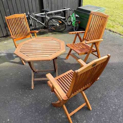 Utematbord i obehandlad massiv teak. Ca 1 år gammalt och alltid haft väderskydd (beige värde 1000kr som ingår).