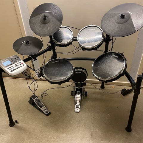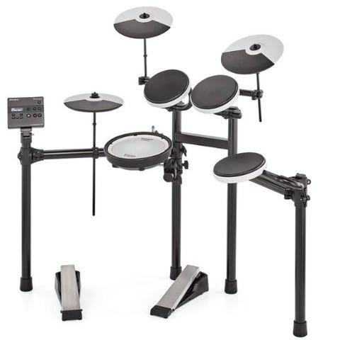 Roland V-Drums elektroniskt trumset med flera trum- och cymbalpads, hi-hat- och baspedal samt stativ. Trumsetet styrs via Roland-modul med olika ljudinställningar och kontroller. Till setet hör även en Roland PM-10 trumförstärkare med volym- och tonkontroller. På bilderna syns även trumpall, trumstockar och hörlurar som ingår i utrustningen samt ett trumöverdrag som skyddar mot damm. Trummorna är sparsamt använda, då det inte övades så flitigt. Nypris för allt är 14400kr, vi säljer det för 11900 kr. Vi köpte allt nytt.