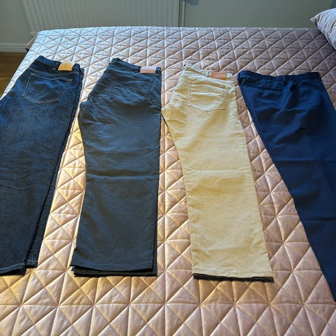 Säljer dessa tre jättefina chinos av Levis i storlek 31x30. Inget som helst problem med dem, sparsamt använda. Det är ett svart par, ett mörkblått par och ett beigt par. Priset på 349kr gäller för allihopa, nypris för ett par ligger på 949kr, se länken nedan. Bara att höra av er om ni undrar något!
