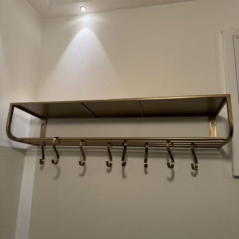 Klassisk hatthylla i metall och trä med två hyllplan i metallgaller. Utrustad med tre krokar undertill. Skickas nedmonterad.