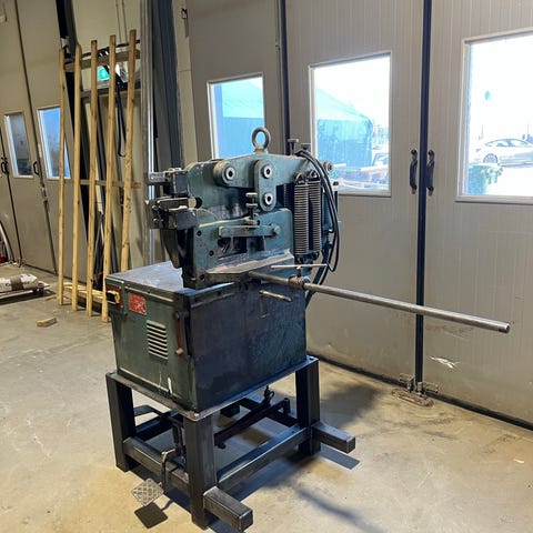 Okänd hyvelmaskin för träbearbetning i grön färg. Maskinen är fristående och eldriven, med motor monterad i underdelen. Arbetsbordet är justerbart och utrustat med flera valsar och anhåll för styrning av arbetsstycken. Avsedd för bearbetning av trä, exempelvis profilering, fräsning och hyvling av brädor och reglar. Passar i verkstad eller snickerimiljö där stationär träbearbetningsutrustning behövs.