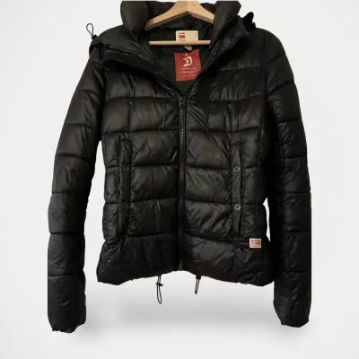 Flare Collection jacka med luva för dam i svart färg, tillverkad i poplin. Jackan är i storlek M och har hellång dragkedja framtill.