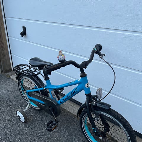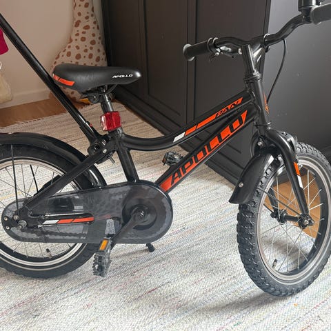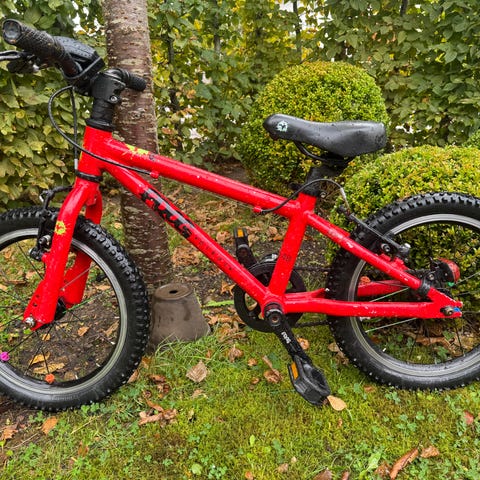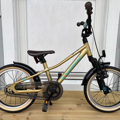 Scott barncykel med 16" hjul. Cykeln har grön ram med orange detaljer och hel kedjeskydd med tryck. Utrustad med raka styren, fotbroms bak och sadel anpassad för barn. Passar som första trampcykel för barn som växt ur balanscykel, vanligtvis i åldern där 16" hjul är lämpligt.