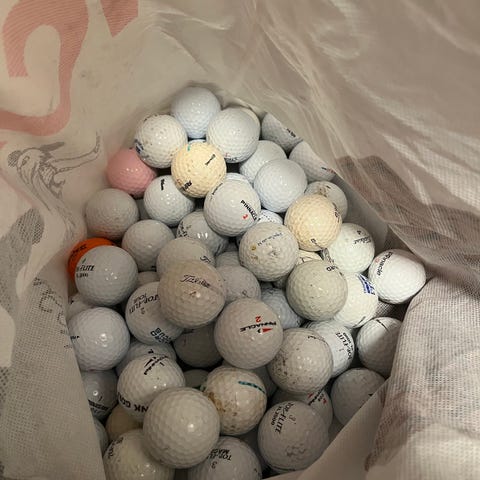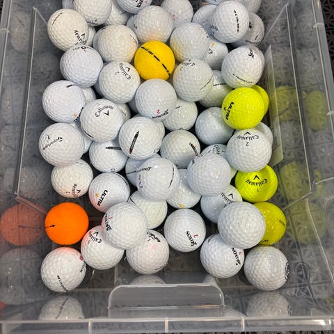 Golfbollar av blandade märken. Flera hundra bollar i huvudsak vita, med några i andra färger. Levereras löst i låda och i plastpåsar. Passar för träning på range eller spel där utseende och exakt modell inte är avgörande.