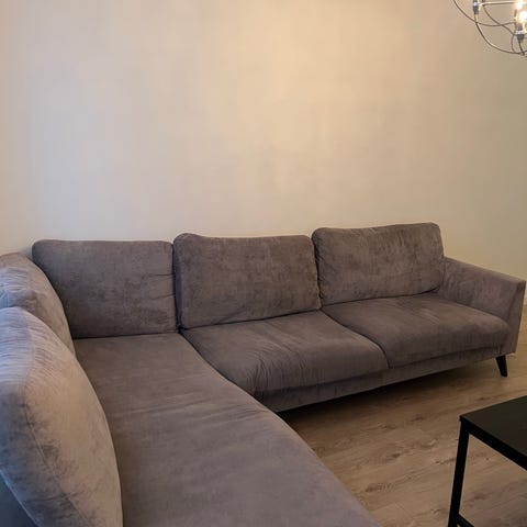 Jättefin soffa i ny skick , inga skavanker , använd endast 5 månader, säljer pga flytt till Stockholm. Mer åt det brunbeiga hållet än bilderna visar. Modell Wave från Nordiska rum , nypris 11995 kr. Se bild för mått och specifikationer.