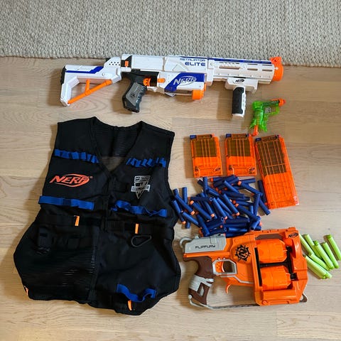 Fyra Nerfar i bra skick med massor av skott. På bilden syns extraskott, dessutom har alla leksaksvapen fulladdade magasin.