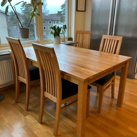 Matbord i ekfanér och 8 svarta stolar