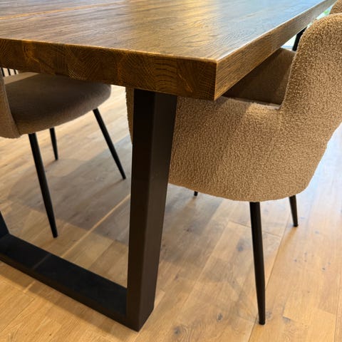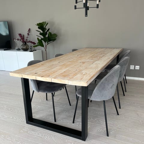 Stort stabilt matbord med 8 svarta stolar