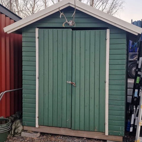 Fristående förrådsbod i trä med vitmålad fasad och sadeltak med tegelpannor. Bodens väggar består av liggande träpanel och taket är invändigt klätt med träskivor och synliga takbjälkar. Invändigt finns hyllplan längs ena långsidan som kan användas för förvaring av trädgårdsredskap, krukor, cykeltillbehör och annat material. Dörren är en dubbel träddörr med handtag . Passar som trädgårdsbod, redskapsbod eller extra förvaringsutrymme på tomten.