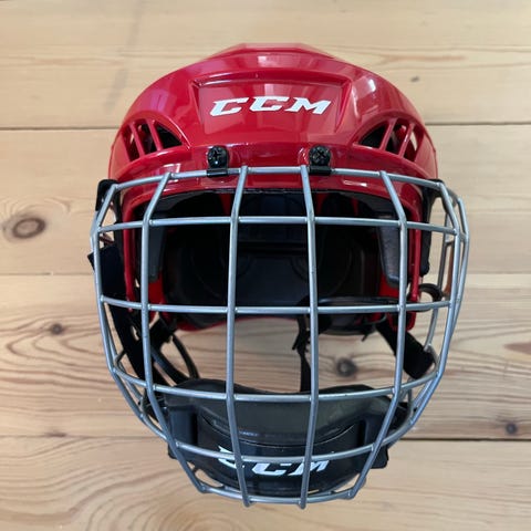 CCM FL80 S hockeyhjälm i röd färg. Knappt använd, Liam blev målvakt så slitage genom förvaring
