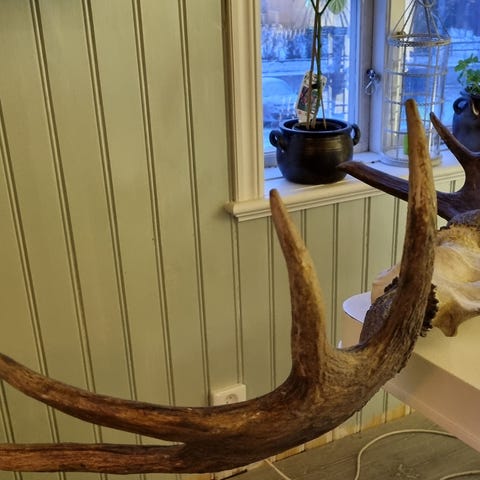 Ungefärliga mått: 90cm bred, 95cm lång, 60cm djup (kronhjortshorn) med 13 spettsar. Det är skjutet, dock skallen blev förstörd så skallen är konstgjord