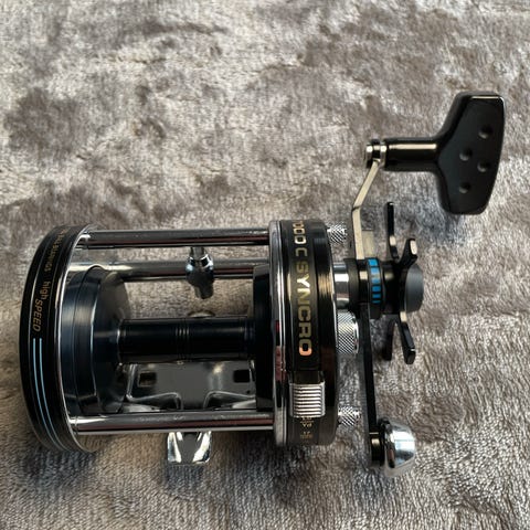 En klassiskt multirulle till det lite tyngre fisket. Typ Lax-fiske, havsöring, gädda eller trolling. Rullen är nysmord och går mycket lätt och fint. Slirbromsen går också mjukt. Har en ljudlig och härligt mekanisk knarr.