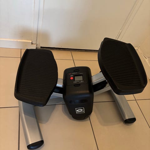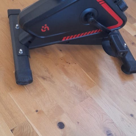 Pedaltränare i svart färg. Utrustad med två pedaler med räfflad yta för bättre fotfäste samt justerbart motstånd via ratt i mitten. Stativet står på två tvärgående ben för stabilitet vid användning. Lämplig för enklare ben- och fotträning sittande, till exempel vid skrivbord eller stol.