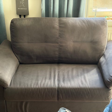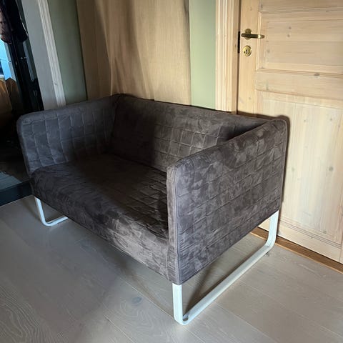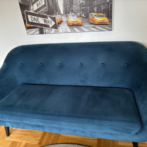 Stilren liten grön soffa från Kingsley till salu. Sparsamt använd, står i hem med katt. Mått enligt bild.