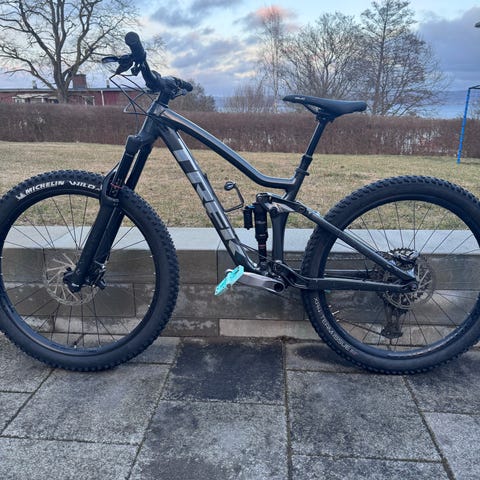 Trek Xcaliber 8 mountainbike med ramstorlek S (för cyklister ca 155-165cm enl Trek - våra barn har dock varit mindre) och 27,5" hjul. Cykeln har luftdämpad framgaffel (Rock Shock Judy), hydrauliska skivbromsar (Shimano MT200) och 1x12 växel (SRAM Eagle SX). Gaffeln servades i höstas.
