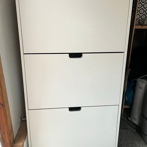Skoskåp från ikea, vit färg. Tre lådor med plats för dubbla rader med skor. Pris 500kr