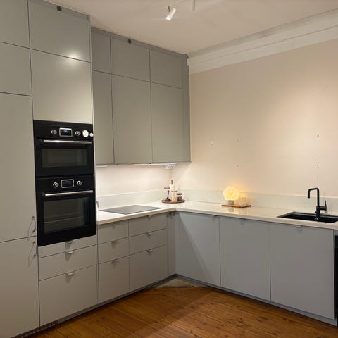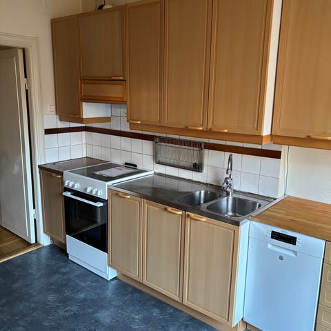 Vissa dörrar saknas, såsom till diskmaskin och kyl/frys. I priset ingår även ugn, diskmaskin och mikro.