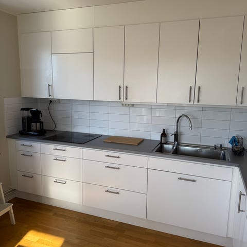 Köksskåp och köksinredning i vit färg med släta luckor och rostfria handtag. Överskåp och underskåp i flera bredder, hörnmodul samt högskåp. Arbetsbänk i trä/träimitation längs två väggar. Vitt kakel som stänkskydd ovan bänkskiva. Inredningen är anpassad för inbyggnadsugn, inbyggnadsmikro, diskmaskin, spishäll, kyl och frys samt dubbeldiskho med blandare. Passar för montering i vinkelkök enligt visad planlösning på bilderna.