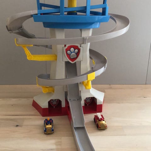 Paw Patrol lekset med utkikstorn, flera fordon och figurer. Setet innehåller ett större utkikstorn i plast med ramp och plattformar samt flera mindre fordon i olika färger kopplade till karaktärerna från Paw Patrol. Tornet har lekts med mycket men ljud och ljus fungerar fint. Figurerna är de som hör till setet ingår och extra figurer som en del inte är original.