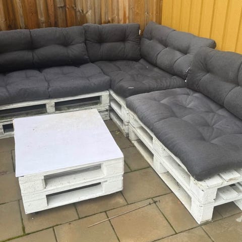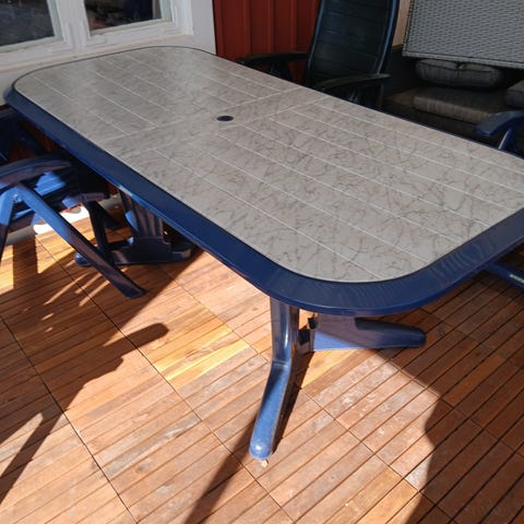 Hopfällbara stolar i trä och metall och fällbar bord. De är i fint skick.
