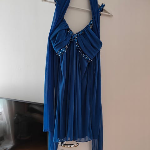 Jättefin marinblå balklänning med tillhörande smycken.