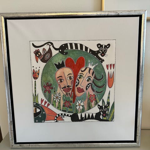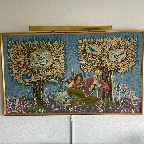 Tavlor med blomstermotiv i smal rektangulär form. Motiven består av stiliserade, färgstarka blommor mot grön bakgrund. Båda tavlorna är inramade