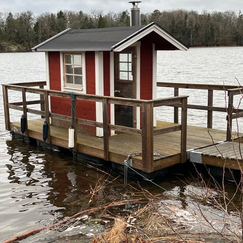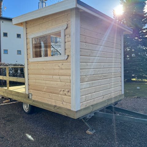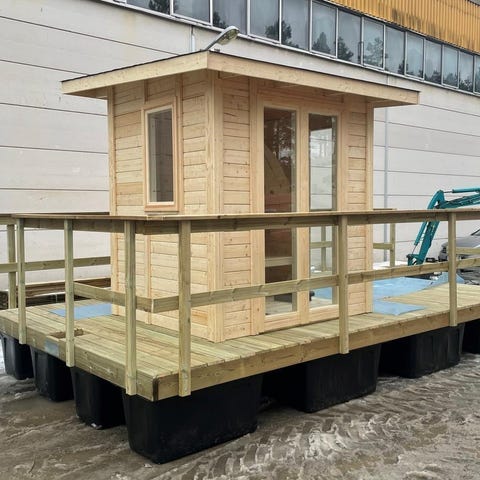Flytande bastu träflotte med vedkamin