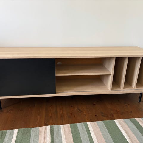 Vi säljer vår gamla tv bänk. Den är svart med valnöt detaljer.