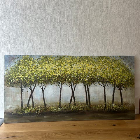 Tavla med trädmotiv i blå toner mot neutral bakgrund. Rektangulärt format som passar att hänga på vägg i exempelvis vardagsrum, hall eller sovrum. Motivet föreställer en rad träd med blå blad och mark i liknande färgskala.