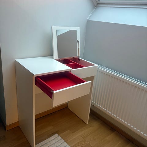 MALM från IKEA :Det finns en glasskiva över bordet som följer med .Det finns gott om plats för smink och smycken i den breda filtklädda lådan.