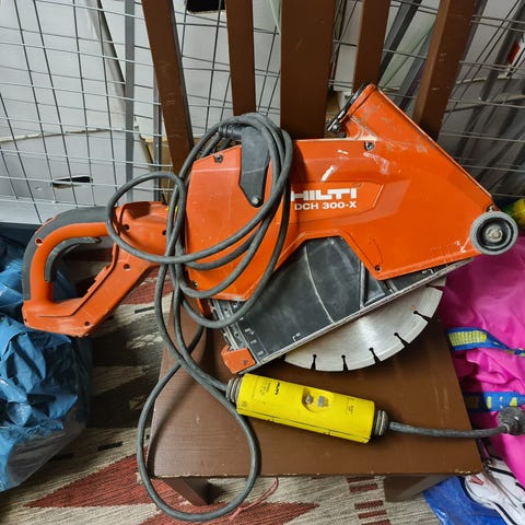 Hilti DCH 300-X väggsåg betongkap i röd färg. Eldriven kapmaskin avsedd för kapning och sågning i betong, murverk och liknande byggmaterial. Utrustad med skyddskåpa runt klingan, främre och bakre handtag för tvåhandsfattning samt anslutning för dammutsug och vattenkylning. Passar för spårning, kapning av öppningar och andra tyngre bygg- och renoveringsarbeten där precisionskapning i mineraliska material behövs.