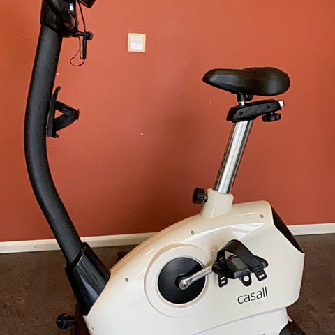 Exerfit motionscykel i grå färg. Utrustad med digital display med knappar för att ställa in och avläsa träningsdata. Cykeln har justerbart sadel och styre med handtag. Pedalerna har remmar för att hålla fötterna på plats. Lämplig för inomhusträning och konditionsträning i hemmet.