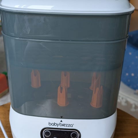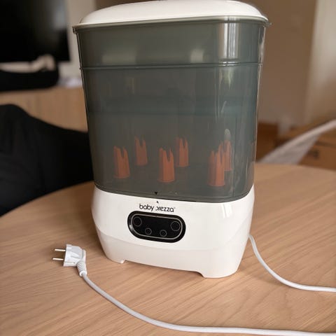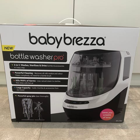 Babybrezza Bottle Washer Pro flaskdiskmaskin för nappflaskor. Rengöring, sköljning, sterilisering och torkning av nappflaskor och tillbehör. Den har plats för flera flaskor och smådelar samtidigt och ansluts med elkabel. 31st diskmedelstabletter medföljer.