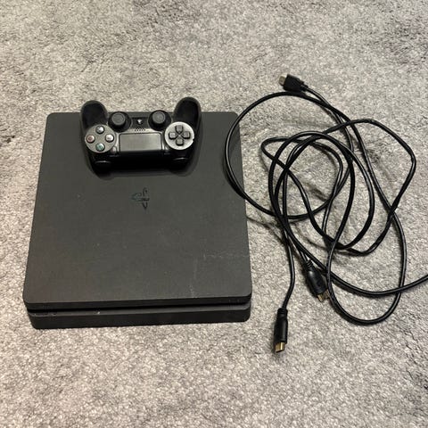 Sony Playstation 4 spelkonsol i svart färg. Standardmodell med tillhörande handkontroll synlig på bilderna. Konsolen lämpar sig för spel, film och streaming och ansluts till tv eller skärm via HDMI. Strömkabel och övriga kablar enligt vad som visas på bilderna.