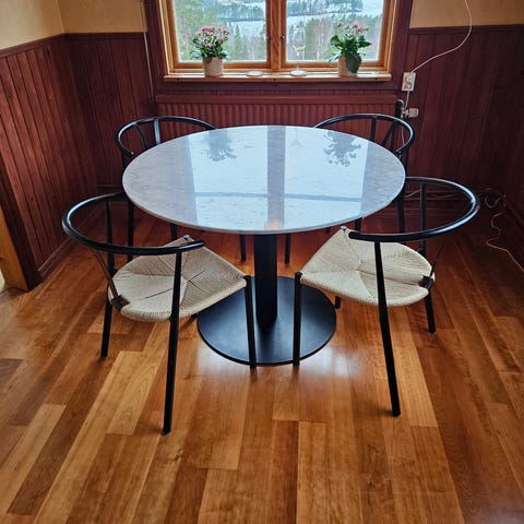 Bord Ikea Mariedamm, mörk skiva ser ut som marmor diam 105cm. 4st stolar Ikea Stein, transparent. Nypris:5700kr.