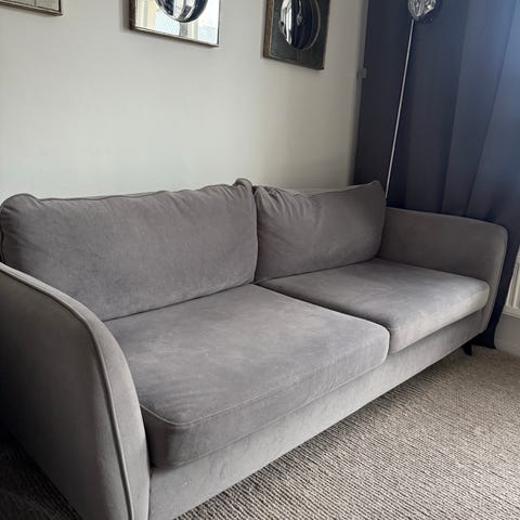 Tre sitt soffan från Mio, heter ’country’, i blåa tyg.