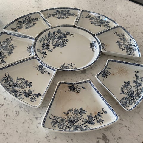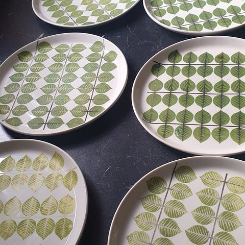 Ett stort serveringsfat designat av Eva Hild. Fatet är tillverkat i fiberbetong och dekorerat med gula citroner på en turkos/grön bakgrund.