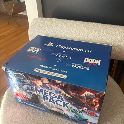 Sony Playstation 4 VR-headset med tillhörande processorenhet och kablar. Paketet inkluderar även Sony Playstation Camera för PS4, som används för spårning av rörelser och position vid användning av Playstation VR. Systemet är avsett för användning tillsammans med Playstation 4-konsol och kompatibla VR-spel och -upplevelser.