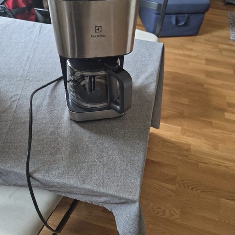 Electrolux kaffebryggare med glaskanna och hölje i rostfritt stål. Bryggaren har vattennivåindikator på sidan och en värmeplatta under kannan. Strömbrytare sitter framtill på basenheten. Avsedd för användning med vanligt eluttag (230 V). Passar för bryggning av filterkaffe i hem- eller kontorsmiljö.