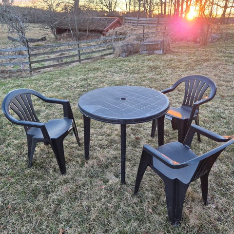 Trädgårdsmöbler i metall som kan vara ute året om. Runt bord (100 cm diameter) med 6 stolar.