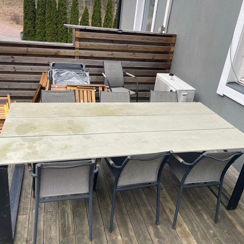 Matgrupp bestående av runt bord och fyra stolar i brun konstrotting. Bordsskivan är rund och ser ut att vara i trä eller träimitation. Stolarna har armstöd och är flätade i samma material som bordets underrede. Passar för uteplats, altan eller balkong där man vill ha en sittgrupp för måltider och samvaro utomhus. Bord 100cm i diameter. Selger samlet for kr 2000,-