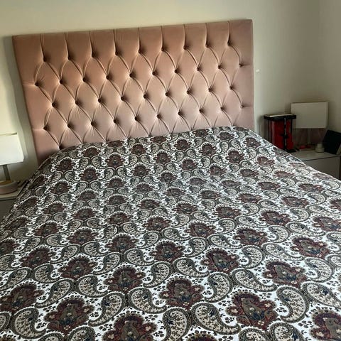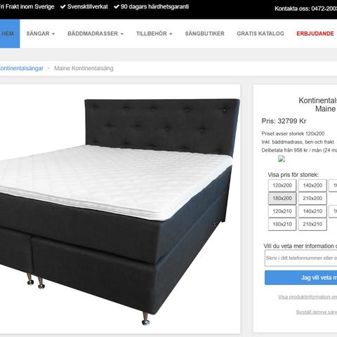 Contintal säng från Leander Persson med resårbotten i grått tyg. Sängen står på ben i metall och har en vadderad sänggavel i ljus textil med knapptuftad design. På sängen ligger en ljus bäddmadrass. Passar som komplett sovplats i sovrum eller gästrum.