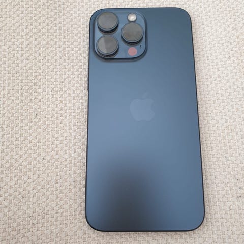 Apple iPhone 17 Pro Max smartphone med 256 GB intern lagring. Modellen har en blå finish och är utrustad med trippelkamera på baksidan samt skärm med rundade hörn och kamerahål upptill på framsidan.