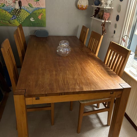 Stadigt matbord, 1 m brett, 2 m långt. Kan bli 3 m långt med 2 påhängsskivor. Ger då plats för 12-14 personer. Rejäl konstruktion. 8 stolar ingår. En stol är missfärgad på sitsen (se bild) men kan troligen åtgärdas.