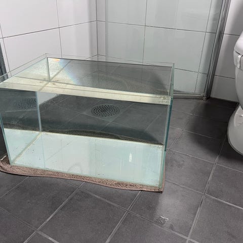 Akvarium i helglas. Rektangulär form med genomskinliga glassidor och glasskivor upptill. Passar för användning som söt- eller saltvattensakvarium beroende på utrustning och inredning som köparen väljer att använda.