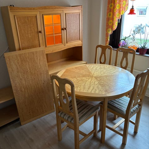 Matgrupp bestående av matbord, stolar samt hög skänk/vitrinskåp i björk . Bordet är ovalt med träribbor och har iläggsskiva/utdragsskiva enligt bild. Stolarna har stoppad sits med randigt tyg. Skänken/vitrinskåpet har överskåp med dörrar, öppna hyllplan i mitten samt underskåp med lådor och dörrar för förvaring. Passar som komplett matgrupp i kök eller matrum.