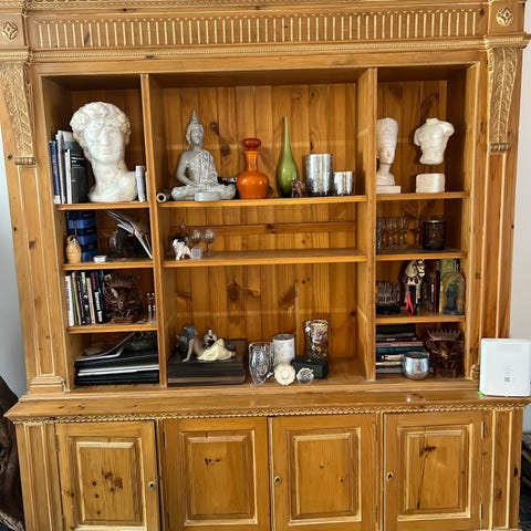 Vitrinskåp i trä med glasdörrar. Skåpet har flera sektioner med spröjsade glaspartier och gångjärnsförsedda dörrar. Passar för förvaring och exponering av porslin, glas eller andra föremål i vardagsrum, matsal eller kök. Träet har en varm ton och synlig ådring som ger ett naturligt utseende.